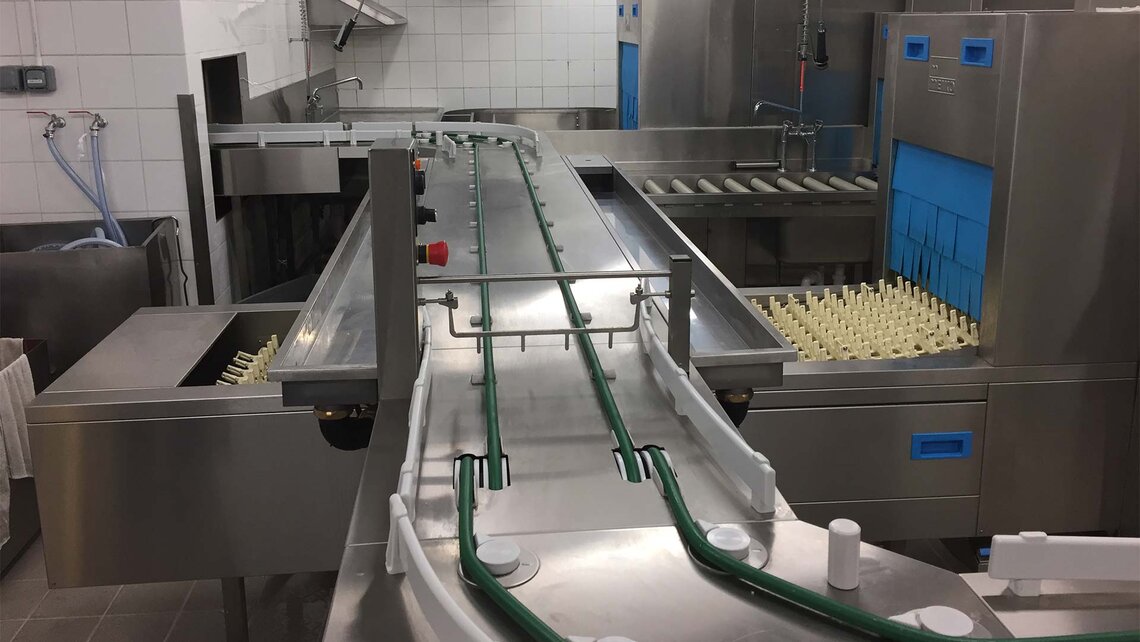 洗碗机每周7天24小时全天候运行,原有的技术条件要求新的洗涤系统,要求平均每天可处理 15,000 个托盘,最大洗涤量达 18,000 个或每分钟 12.5 个托盘!