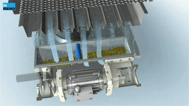 Hygienic working starts right from the infeed: food waste is automatically washed off at regular intervals using a powerful blast of water. Just like a big, cleaning waterfall!