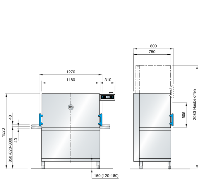 | Dimensions (W x Hmin x D) | 1180 (1270) x 1520 x 750 (800) mm (mit Griffe mm |