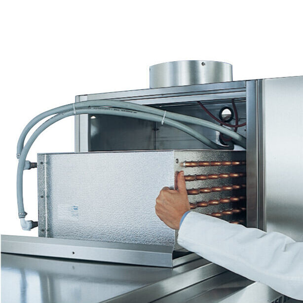 Heating recovery system saves energy, reduces steam emission and effectively improves the air quality in the dishwashing room.