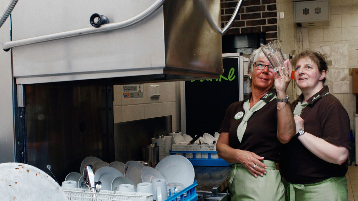 “回收篮和脏污的盘子可以一起送入洗碗机,清洁结束后重新取出”,与此同时 Manuela George 员工还高度评价了直推式洗涤机符合人体工程学原理的操作高度。