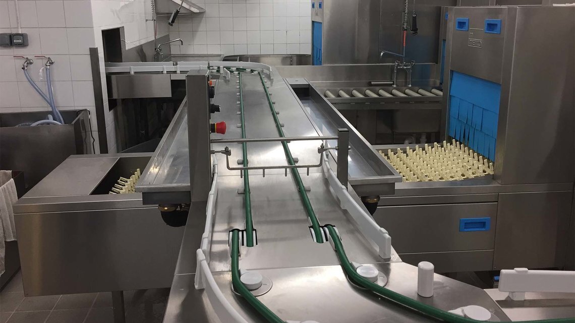 随着澳门银河的扩大,以及工作量的增加,洗碗机每天24小时全天候运行,原有的洗涤系统难以应对新的洗涤需求:平均每天处理15,000个托盘,最大洗涤量达18,000个或每分钟12.5个托盘!为应对新的洗涤需求,澳门银河采用了MEIKO为其制定的解决方案,包括MEIKO节能环保及智能清洗技术的明星产品——M-iQ传送式洗碗机,以及餐具自动分拣系统、托盘清洗机、托盘堆叠车、托盘传送带等产品。
