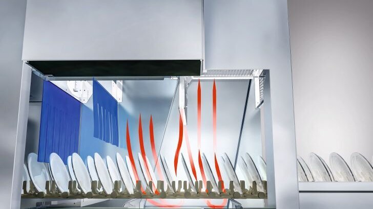 以迈科M-iQ烘干系统为例,烘干区独特的气流设计,能均衡并合理地从洗涤区和出口区抽取干燥空气,热风烘干餐具后,由热回收系统进行回收及再利用,保障烘干效果的同时实现节能降耗,且机器出口端无热气外溢,从而确保操作区舒适的环境。