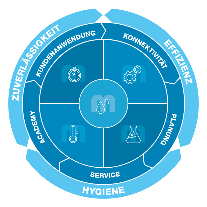MEIKO 的 Clean Solution Circle 考虑到了清洁过程中所有关键的参数以及它们彼此相互作用与依赖的关系。
