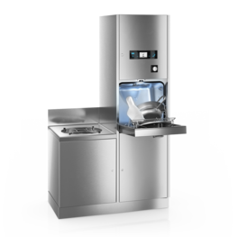 这是一种能够发挥最大作用的微型不锈钢配套组合:这种便盆清洗消毒机可嵌装在定制化组装的不锈钢配套组合中。在储存台面、卫生污水池、洗手盆以及必要时组装的配套柜子的配合下,形成一个功能强大的整体,可创造更好的卫生条件,将其紧凑型结构发挥至极致。这种系统为创造卫生条件提供辅助作用,避免了可引起医院感染的危险病菌。只需安放妥当,连接后即可使用。这种带有 TOPIC 便盆清洗消毒机的不锈钢配套组合也可以进行事后改装,例如添加一个底柜、增加一些操作台面、一个大洗手槽以及附装可摆放便盆、尿壶、肾形盘或儿童坐便器的置物架。