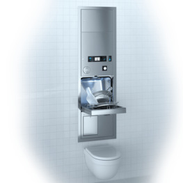 安装模块完全采用即装即连型,可以隐藏在瓷砖墙的后面。由于附加的中央接口可以连接所有常规类型的座便器,因此可以将便盆清洗消毒机固定在座便器的上方,这样非常适合直接安装在患者病房的套间浴室内。